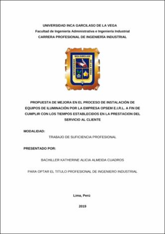 Item Propuesta de mejora en el proceso de instalación de equipos de iluminación por la empresa Opsem E.I.R.L. a fin de cumplir con los tiempos establecidos en la prestación del servicio al cliente(Universidad Inca Garcilaso de la Vega, 2019-04-12) Almeida Cuadros, Katherine AliciaEl presente trabajo desarrolla sobre los principales problemas de la deficiencia en los procesos que tiene la empresa en el sector de electricidad (empresa OPSEM E.I.R.L.), donde se han propuesto mejoras mediante herramientas de ingeniería para reducir los tiempos improductivos y aumentar la productividad. El objetivo principal es realizar la mejora del proceso de instalación de equipos de iluminación por la empresa OPSEM E.I.R.L. a fin de cumplir con los tiempos establecidos en la prestación del servicio al cliente, basándose en estudios de tiempos en las operaciones considerando los conceptos de ingeniería de métodos, en esta se han empleado técnicas como las 5S´s en el área de del taller con la finalidad de generar un cambio en la cultura y trabajo en equipo en la organización ya que es el área fundamental para la selección y acceso de materiales, herramientas y equipos; además se han empleado diagramas de causa-efecto, diagrama de operaciones, diagrama de actividades para el desarrollo de las actividades dentro de la planta del cliente. Se desarrolló la metodología del estudio de trabajo para registrar, examinar, definir y establecer la propuesta de mejora, y así determinar un mayor alcance de todo el diagnóstico actual de la empresa en conjunto con el personal que lo conforma. Finalmente, este trabajo propone la reducción de los tiempos de trabajo del servicio de instalación de equipos de iluminación, dando prioridad a la agilización, rapidez, inspección, controles, indicadores, programas, formatos y una mejora continua, con el objetivo de mejorar la productividad y el servicio al cliente.