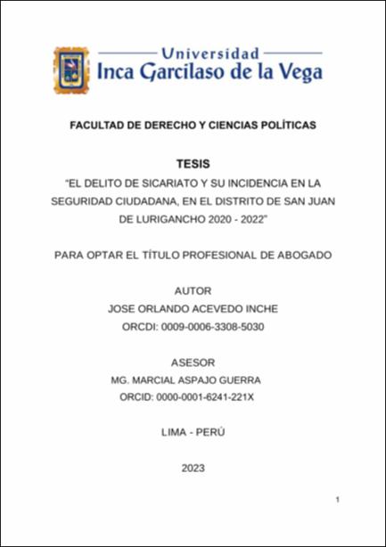 Item El delito del Sicariato y su incidencia en la seguridad ciudadana, en el Distrito de San Juan de Lurigancho 2020 - 2022(Universidad Inca Garcilaso de la Vega, 2024-04-04) Acevedo Inche, José Orlando; Aspajo Guerra, MarcialEn el trabajo de investigación se estableció como problema general ¿De qué manera, el delito de Sicariato incide en la seguridad ciudadana, en el Distrito de san Juan de Lurigancho, 2020-2023? señalándose como objetivo, analizar la manera en que el delito de Sicariato incide en la seguridad ciudadana, en el Distrito de san Juan de Lurigancho, 2020-2023.Durante la elaboración de esta investigación, se llevó a cabo un metodológico análisis de las bases teóricas que sustentan el tema de estudio, que en este caso es la incidencia del delito de sicariato en la seguridad ciudadana en el distrito de San Juan de lurigancho. El propósito principal de este análisis fue determinar el grado de incidencia y la conexión entre las variables propuestas en este estudio.Para respaldar la hipótesis general propuesta, se usaron técnicas e instrumentos de investigación. Estos recursos permitieron confirmar la afirmación presentada, como se puede verificar en el capítulo de resultados y en la discusión de estos.