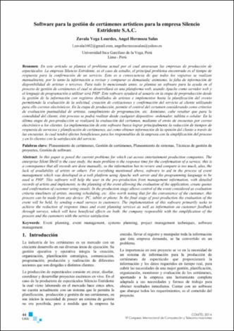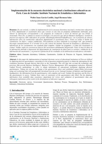 Item Implementación de la encuesta electrónica nacional a instituciones educativas en Perú. Caso de estudio: Instituto Nacional de Estadística e Informática(Universidad Inca Garcilaso de la Vega, 2014-10) García Castillo, Walter Isaac; Hermoza Salas, AngelEn este artículo, se define la implementación de la encuesta electrónica nacional a instituciones educativas en Perú, digitalizando el cuestionario físico que consiste en una lista de preguntas debidamente elaborada, para obtener la información correspondiente a las preguntas de evaluación a través de Internet que nos brinde el encuestado. Para ello, se tomará en cuenta la tecnología y los procesos que ofrecen Business Intelligence, Gestión de procesos de negocios, KPI, indicadores de gestión, Metodología RationalUnifiedProcess, con el propósito de obtener información sobre las instituciones educativas digitalizando el cuestionario físico. Tomar en cuenta el diseño del cuestionario, los flujos y rangos establecidos. Procesamiento en línea utilizando la tecnología web que permitirá descargar automáticamente en el servidor de la sede central del Instituto Nacional de Estadística e Informática, la información de los cuestionarios con resultado final completo. Validar las preguntas y el flujo del cuestionario a evaluar. Validar reglas de consistencias básicas del cuestionario debidamente diligenciado. Poner la base de datos de la información obtenida a disposición del departamento de consistencia de datos para su revisión y validación de la información del cuestionario y su posterior explotación de los resultados en la elaboración de indicadores solicitados.Item Indicadores claves de rendimiento, alertas y puntos de control para el seguimiento de procesos logísticos. Caso: EsSalud Perú(CLAIO Monterrey 2014, 2014-10) Portugal Peñaranda, Betzy Liliana; Hermoza Salas, AngelLas nuevas tendencias en la administración y control de la información en las organizaciones exigen herramientas de gestión que les proporcione datos de manera eficaz y eficiente, a fin de ofrecer un adecuado soporte para tomar las decisiones más adecuadas relacionadas al logro de sus objetivos corporativos en el menor tiempo posible. Los sistemas de información deben estar provistos de los recursos necesarios que satisfagan ésta demanda. La metodología que ayuda de manera determinante la obtención de éstas herramientas de manera eficiente y facilitan la administración y optimización de los procesos de negocio es BPM – Business Process Management y dichas herramientas de gestión además deben estar asociadas a tableros de control que, en base a indicadores clave de rendimiento, les permita establecer medidas preventivas y/o correctivas: así mismo, en áreas de trabajo como inteligencia de negocios, permita establecer lineamientos necesarios para configurarlos indicadores más adecuados a su organización. El presente documento propone y sustenta de qué manera éstas herramientas de gestión promueven la mejora de uno de los procesos más importantes que se desarrolla en EsSalud, constituida como una de las mayores empresas prestadoras de Salud en Perú, como es el control y seguimiento de los procesos de adquisición de recursos que anualmente desarrolla. Como primer paso, se ha realizado un estudio comparativo de algunas herramientas que ya existentes en el mercado, a fin de establecer las funcionalidades más relevantes para nuestro sistema, sobre los cuales se han definido un conjunto de indicadores claves de rendimiento, los mismos que, a fin de mejorar el sistema propuesto, sus tiempos de ejecución son controlados a través de la configuración de alarmas y sometidos a proceso de seguimiento continuo a través de la implementación de un tablero de control, actividades que desarrolladas de manera integral permitirán el logroItem Sistema de información para monitoreo de neumáticos del área de despacho (Dispatch), en una compañía minera(Universidad Inca Garcilaso de la Vega, 2014-10) Vargas Cueto, Elard Leonel; Hermoza Salas, AngelEn este artículo, se busca implementar una solución adecuada para el monitoreo de neumáticos en tiempo real de la flota de camiones de una compañía minera. La operación exitosa de un centro minero representa un verdadero reto, por dos razones importantes: asegurar cero accidentes de trabajo y que sea productiva reduciendo costes de operación. Para lograr esto, la aplicación de tecnología de punta se convierte en un pilar fundamental. Con ella, podemos mejorar los procesos, generar valor y hacer la empresa más rentable. Se va a describir el proceso de implementación de esta solución tanto en hardware como en software, y se dará a conocer la experiencia obtenida durante el periodo de implementación hasta su puesta en marcha.Item Sistema de monitoreo de compromisos sociales y ambientales en actividades extractivas utilizando inteligencia de procesos(INTERCON 2014, 2014-08) Dos Santos, Laura; Hermoza Salas, AngelIn this paper are defined the hydrocarbons enterprise’s needs to monitoring social and environmental agreements that they make in their extractive activities. These enterprises make at their job locations, many agreements with people and authorities. These agreements are listed in no unified tools, making it difficult to control and tracking. The failure to comply with them or their dates, ends on fines to the company and influencing negatively in their competition in the market. The amount and types of agreements vary from contract to contract and will depend on associated standards and the Environmental Impact Assessment (EIA) related, but failure of a single agreement, may lead directly to the dissolution of the contract. It is essential for this type of business a software tool that, on one hand, help bring an orderly control through key performance indicators (KPI's) and, in turn, include warnings to time sent to those responsible for necessary to fulfill th