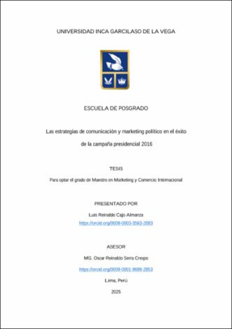 Item Las estrategias de comunicación y marketing político en el éxito de la campaña presidencial 2016(Universidad Inca Garcilaso de la Vega, 2025-04-07) Cajo Almanza, Luis Reinaldo; Serra Crespo, Oscar ReinaldoLa presente tesis tuvo como objetivo determinar la relación entre las estrategias de comunicación y el marketing político en el éxito de la campaña presidencial 2016. El diseño de investigación empleado fue el correlacional, así como el diseño descriptivo comparativo. El universo estuvo conformado por 450 votantes, la población estudiada fue de 400 votantes y la muestra quedó conformada por 356 votantes seleccionados voluntariamente. El instrumento utilizado para medir las variables fue un cuestionario constituido por un total de 24 preguntas, en cuya elaboración se utilizó la escala de Likert; 12 de las preguntas son para medir la percepción de la comunicación política, y las otras 12 preguntas miden la percepción del marketing político. El instrumento aplicado fue previamente sometido a validez de contenido por juicio de expertos, con la participación de un doctor en psicología y un doctor en educación. Para la comprobación de hipótesis, se utilizó la prueba estadística de correlación de Spearman, así como la U de Mann-Whitney para las hipótesis de comparación. Los resultados indican que el valor de la correlación de Spearman obtenido entre las variables de estudio (estrategias de comunicación y marketing político) es de rho = 0,479, el cual es significativo al nivel de p<0,01. Asimismo, se encontró que las diferencias entre votantes del sexo femenino y masculino, respecto a su percepción de las estrategias de comunicación política, son significativas al nivel de p<0,01, apreciándose un mayor rango promedio en el grupo del sexo masculino. En conclusión, se comprobó que la percepción de la comunicación política se relaciona directamente con la percepción del marketing político en el éxito de la campaña presidencial 2016.Item Marketing digital y las exportaciones de PYMES de Lima Metropolitana dedicadas a la confección de joyas artesanales de plata al Mercado de México(Universidad Inca Garcilaso de la Vega, 2022-05-19) Pazos Falcon, Arturo Manuel; Principe Lopez, Julio FidelEl objetivo principal de la investigación fue determinar si el Marketing Digital se relaciona con las Exportaciones de las PYMES de Lima Metropolitana dedicadas a la confección de joyas artesanales de plata al mercado de México. La Variable Independiente es el Marketing Digital (Dimensiones: Páginas Web, Motores de Búsqueda, Blog Corporativo, Emailing Marketing y los Perfiles Sociales). La Variable Dependiente es la Exportación (Dimensiones: Ventas, Facturación y Demanda). La Población estuvo conformada por 400 PYMES exportadoras dedicadas a la confección de Joyas Artesanales, Agrupadas en 10 Asociaciones en todo el Perú. La muestra final para la investigación estuvo constituida por 66 PYMES (3 Asociaciones) ubicadas en Lima Metropolitana. El tipo de investigación es el no experimental, el nivel de investigación es la aplicada, el método usado es el correlacional y es cuantitativa ya que se analizan y se recogen datos con la finalidad de asociar las variables de investigación. Se empleó como instrumento de recojo de información para la investigación una encuesta con 23 Ítems (tipo escala de Likert) desagregadas en 5 dimensiones para la primera variable y 3 para la segunda. Para medir la confiabilidad y validez se sometió al estadístico Alfa de Cronbach y Juicio de Expertos, respectivamente. Con los resultados obtenidos se logró demostrar que, el Marketing Digital se relaciona significativamente con las Exportaciones de las PYMES de Lima Metropolitana dedicadas a la confección de joyas artesanales de plata al mercado de México.Item El marketing organizacional como estrategia de motivación a los colaboradores y la calidad de los servicios de la Municipalidad del Distrito de Surco - Lima, 2019-2020(2022-03-09) Delgado Alcalde, Danna Jennifer; Durand Saavedra, PedroEl marketing es importante para cualquier organización, dado que ayuda a las empresas a mejorar su integración dentro de la misma, interconectando otros departamentos y así lograr una visión más amplia en cuanto a la calidad del servicio que debe recibir el usuario tanto en instituciones como del sector empresarial, dado que la satisfacción brinda seguridad en todo ámbito. El objetivo general del estudio fue: Demostrar si el marketing organizacional como estrategia de motivación a los colaboradores, incide en la calidad de los servicios en la Municipalidad del distrito de Santiago de Surco – Lima, 2019-2020. El tipo de investigación fue explicativo y el nivel aplicativo; por otro lado, el método y diseño de investigación fue expos facto o retrospectivo; y con relación a la población objeto de estudio estuvo constituida por la Municipalidad Distrital de Santiago de Surco con una muestra de 343 colaboradores con un muestreo de probabilidad del 95% de confianza y con un 5% como margen de error. Respecto a los instrumentos utilizados para la medición de las variables fue la técnica de la encuesta con su instrumento el cuestionario, el cual fue validado por Doctores en Administración y Finanzas expertos en la materia que realizaron la evaluación y que dieron la validación de criterios y de constructo; con relación a la prueba estadística fue el chi cuadrado, corregida por Yates. En conclusión, se ha demostrado que el marketing organizacional como estrategia de motivación a los colaboradores, incide significativamente en la calidad de los servicios en la Municipalidad del distrito de Santiago de Surco – Lima, 2019-2020.Item Estrategias de marketing y el nivel de ventas de soya orgánica en Lima Metropolitana(Universidad Inca Garcilaso de la Vega, 2020-01-20) Carrasco Carrasco, Pedro Wilfredo; Vigil Cornejo, Fernando RafaelEl presente trabajo de investigación