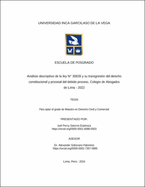 Item Valoración de una Prueba Ilícita y su Incidencia en los Procesos Civiles de Tutela Judicial Efectiva, Distrito Judicial de Abancay, 2023.(Universidad Inca Garcilaso de la Vega, 2025-12-04) Abuhadba Batallanos, Juan Nicolas; Velarde Ramirez, AlbertoEn el presente trabajo de investigación titulado valoración de una prueba ilícita y su incidencia en los procesos civiles de tutela judicial efectiva, distrito judicial de Abancay, 2023, tuvo como objetivo el de determinar la relación existente entre el uso indebido de las pruebas ilícitas y la afectación al derecho de la tutela judicial efectiva de las partes en los procesos civiles del distrito judicial de Abancay, 2023, teniendo como enfoque de investigación el cuantitativo, el tipo de investigación fue básico, el diseño no experimental, la técnica utilizada para la recolección de datos fue la encuesta y el instrumento el cuestionario, como resultado se obtuvo que el 63% de los encuestados Si creen que en la actualidad se utilizan pruebas ilícitas en los procesos que afectan los derechos fundamentales de las partes procesales y que pasan desapercibida por el juez, llegando a la conclusión que existe una relación directa entre el uso indebido de las pruebas ilícitas y la afectación al derecho de la tutela judicial efectiva de las partes en los procesos civiles del distrito judicial de Abancay, 2023Item Impacto del régimen de separación de patrimonios en las uniones de hecho en la legislación peruana(Universidad Inca Garcilaso de la Vega, 2025-09-04) Helguero Rasilla, Evelyn Stefany Lizzet; Velarde Ramirez, AlbertoEl presente trabajo de investigación tuvo como objetivo, determinar el impacto del régimen de separación de patrimonios en las uniones de hecho en la legislación peruana. Respecto a los aspectos metodológicos del trabajo, el tipo de investigación fue el descriptivo y el nivel aplicado. La población estuvo conformada por los abogas hábiles del Colegio de Abogados de Lima, conocedores del régimen de separación de patrimonios en las uniones de hecho, los mismos que ascienden a 24,500 personas. La muestra estuvo conformada por 378 personas, a los cuales se les aplicó el instrumento que constó de 24 preguntas, utilizando la escala de Likert con alternativas de respuesta múltiple. Se procedió a analizar los resultados, luego se realizó la contrastación de hipótesis, utilizando la prueba estadística conocida como coeficiente de correlación de Spearman, debido a que las variables de estudio son cualitativas. Finalmente, se pudo determinar que el régimen de separación de patrimonios impacta significativamente en las uniones de hecho en la legislación peruana.Item Análisis descriptivo de la ley N° 30628 y su transgresión del derecho constitucional y procesal del debido proceso, Colegio de Abogados de Lima 2022(Universidad Inca Garcilaso de la Vega, 2025-09-03) Saturno Espinoza, Joel Percy; Solorzano Palomino, AlexanderEl presente trabajo de investigación tuvo como objetivo, determinar la relación de la aplicación de la ley N°30628, que modifica el proceso de filiación judicial de paternidad extramatrimonial dada por ley N°28457, con el derecho constitucional y procesal del debido proceso.Respecto a los aspectos metodológicos del trabajo, el tipo de investigación fue el descriptivo y el nivel aplicado.La población estuvo representada por los 27500 abogados hábiles del Colegio de Abogados de Lima.La muestra estuvo conformada por 379 abogados hábiles, a los cuales se les aplicó el instrumento que constó de 24 preguntas, utilizando la escala de Likert con alternativas de respuesta múltiple.Se procedió a analizar los resultados, luego se realizó la contrastación de hipótesis,utilizando la prueba estadística conocida como coeficiente de correlación de Spearman, debido a que las variables de estudio son cualitativas.Finalmente, se pudo determinar que la aplicación de la ley N°30628, que modifica el proceso de filiación judicial de paternidad extramatrimonial dada por ley N°28457, se relaciona directamente con el derecho constitucional y procesal del debido procesoItem Conciliacion extrajudicial y su impacto en la resolucion de conflictos en Lima Este(Universidad Inca Garcilaso de la Vega, 2025-08-19) Rodriguez Sánchez, Shirley Miriam; Cárdenas Mendoza, Juan JaimeLa presente investigación tuvo como objetivo determinar el impacto la Conciliación Extrajudicial en la Resolución de Conflictos en Lima Este, es decir la relación entre la Conciliación Extrajudicial y la Resolución de Conflictos. En la metodología, la muestra estuvo constituida por 20 abogados conciliadores, capacitados que han llevado procedimientos conciliatorios en Lima Este, a los que se le realizó una encuesta, habiéndose trabajado con los indicadores, que facilitaron la elaboración del instrumento, el mismo que fue validado por expertos. El desarrollo del presente estuvo estructurado con fundamentos teóricos de diferentes autores que han respaldado las variables en referencia; así como el respaldo normativo, antecedentes nacionales e internacionales, aspectos metodológicos para la formulación de los problemas, objetivos; siendo a su vez complementado con el método, entre otros. Se utilizó un cuestionario de 20 preguntas, donde el abogado conciliador participante manifestó su grado de desacuerdo o acuerdo. Los resultados de la estadística inferencial muestran que, tras aplicar la prueba estadística de Rho Spearman, cuyo valor fue 0.0079, se encontró relación significativa entre obligatoriedad de conciliación y resolución de conflictos; por lo que se concluye que existe correlación entre obligatoriedad de la conciliación y resolución de conflictos, y que esta correlación es positiva moderada.Item Valoración de medios probatorios e interés superior del niño y adolescente en las sentencias de alimentos del distrito de Chaclacayo 2024(Universidad Inca Garcilaso de la Vega, 2025-08-08) 