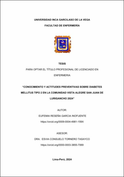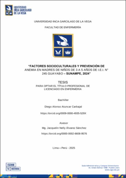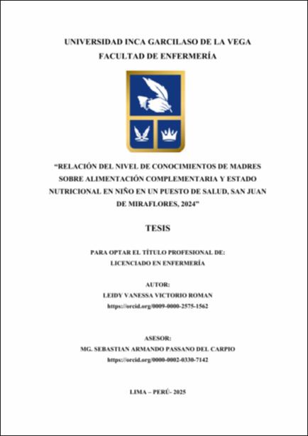 Item Factores socioculturales y prevención de anemia en madres de niños de 3 a 5 años de I.E.I. N° 245 Guayabo – Sunampe, 2024(Universidad Inca Garcilaso de la Vega, 2025-09-10) Atuncar Carbajal, Diego Alonso; Alvarez Sanchez, Jacquelin NellyObjetivo: Determinar la relación que existe entre factores socioculturales y prevención de la anemia en madres de niños de 3 a 5 años del Institución Educativa Inicial N° 245 Guayabo - Sunampe, 2024. Material y método: Estudio de tipo no experimental, transversal y prospectivo, la muestra fue de 52 madres a quienes se les aplico el primer instrumento con 17 ítems y el segundo instrumento con 14 ítems, los resultados se presentaron de forma descriptivas y se utilizó la correlación de Spearman para la comprobación de las hipótesis. Resultados: Se observó que el Sí existe una correlación entre los factores sociales que son Estado Civil, Qué edad tiene, Ocupación laboral, Quienes viven en su casa, Cuanto es el ingreso familiar, Tipo de vivienda, Material predominante de la vivienda, Servicios en su hogar, Que seguro tiene el niño(a), (sig. < 0.05) con prevención de la anemia, de igual manera si existe una correlación entre los factores culturales que son Nivel de instrucción, Qué religión profesa, Idioma predominante en su hogar, Qué programa usted consume, A qué edad tuvo su primer hijo, Número de hijos, Usa algún método anticonceptivo, Planificó tener cada uno de sus hijos, (sig. < 0.05) con prevención de anemia. Conclusiones: Si hay relación entre factores socioculturales y prevención de la anemia en madres de niños de 3 a 5 años del Institución Educativa Inicial N° 245 Guayabo - Sunampe, 2024, debido que se halló una sig.(bilateral) 0.000 es menor a 0.005 aceptando la hipótesis alterna.Item Conocimiento y actitudes preventivas sobre diabetes mellitus tipo 2 en la comunidad Vista Alegre San Juan de Lurigancho 2024(Universidad Inca Garcilaso de la Vega, 2025-08-13) García Inofuente, Eufemia Reseña; Tornero Tasayco, Esvia ConsueloLa presente investigación tiene como objetivo general Identificar los Conocimientos y actitudes preventivas sobre la diabetes mellitus tipo 2 en los pobladores de la Comunidad de Vista Alegre del distrito de San Juan de Lurigancho 2024. El estudio es cuantitativo básico de corte transversal no experimental, descriptivo simple. La población y muestra fue de 300 y 56 pobladores respectivamente. La técnica utilizada fue las encuestas validadas por expertos nacionales y extranjeros. Los Resultados fueron: con respecto al conocimiento sobre la diabetes mellitus tipo 2 el 78.6 % tienen Conocimiento Medio ,7.1% Conocimiento bajo y 14.3% conocimiento alto respectivamente. Los conocimientos en las dimensiones Generalidades de la enfermedad fueron 78.6% conocimiento medio, 8.9% conocimiento bajo, 12.5% conocimiento alto respectivamente. Los conocimientos de la Dimensión complicaciones de la enfermedad fueron: 46.4% conocimiento medio, 42.9% conocimiento bajo y solo 10.7% conocimiento alto. Al determinar las actitudes preventivas sobre la Diabetes Mellitus tipo 2. Los resultados fueron 98.2% de Indiferencia 1.8 % de rechazo. La conclusión: Los pobladores de la Comunidad de Vista Alegre del distrito de San Juan de Lurigancho 2024 presentan Conocimiento Medio y actitud de indiferencia ante la enfermedad Diabetes mellitus tipo 2.Item Relación del nivel de conocimientos de madres sobre alimentación complementaria y estado nutricional en niño en un puesto de salud, San Juan de Miraflores, 2024(Universidad Inca Garcilaso de la Vega, 2025-08-13) Victorio Roman, Leidy Vanessa; Passano Del Carpio, Sebastian ArmandoLa investigación tiene como objetivo determinar la relación entre el nivel de conocimientos de las madres sobre la alimentación complementaria y el estado nutricional de los niños de 6 a 12 meses. Diseño: Estudio descriptivo, de tipo básico, diseño no experimental y corte transversal. Lugar: Puesto de Salud Desiderio Moscoso Castillo, San Juan de Miraflores. Participantes: 44 madres de niños de 6 a 12 meses de edad del P.S. Desiderio Moscoso, San Juan de Miraflores. Intervenciones: Se aplicó la técnica de la encuesta y como instrumento la Escala de Nivel de Conocimiento Materno sobre Alimentación Complementaria (ENCMA), de 20 ítems previamente validado. Resultados: Se muestran resultados descriptivos que reflejan un nivel medio de conocimientos sobre alimentación complementaria en la mayoría de las madres y un estado nutricional entre normal y con sobrepeso en la mayoría de los niños, evidenciándose resultados inferenciales que permitieron aceptar la hipótesis planteada. Conclusiones: Existe relación entre el nivel de conocimiento de la madre sobre alimentación complementaria y el estado nutricional del niño de 6 a 12 meses del Puesto de Salud Desiderio Moscoso Castillo, San Juan de Miraflores, 2024.Item Calidad de vida y autocuidado en pacientes con diabetes mellitus tipo 2 atendidos en un Hospital del Cusco, 2024(Universidad Inca Garcilaso de la Vega, 2025-06-30) Baca Ibarra, Alejandro; Passano Del Carpio, Sebastian ArmandoObjetivo: Determinar la relación entre la calidad de vida y el autocuidado en pacientes con diabetes mellitus tipo 2 atendidos en un Hospital del Cusco, 2024. Metodología: Cuantitativo, prospectivo, aplicativo, descriptivo y correlacional. Población y muestra: La población conformada por 92 pacientes y la muestra constituida por 65 pacientes que cumplan los criterios de selección. Técnica e instrumento: La técnica fue la encuesta y se empleó cuestionarios validados denominados WHOQOL-BREF con 26 ítems y SUMMARY OF DIABETES SELF-CARE ACTIVITIES MEASURE con 7 ítems para recopilar información sobre la calidad de vida y autocuidado de los pacientes. Resultados: Se encontró que, respecto a las características sociodemográficas analizadas, los datos de mayor frecuencia son, la edad de ≥61 años con 53.8%, el sexo masculino con 52.3