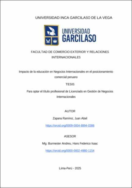 Item Impacto de la educación en Negocios Internacionales en el posicionamiento comercial peruano(Universidad Inca Garcilaso de la Vega, 2025-08-21) Zapana Ramírez, Juan Abel; Burmester Andreu, Hans Federico IsaacEl presente estudio analiza el impacto de la educación en Negocios Internacionales en el posicionamiento comercial del Perú, formulando como problema general la pregunta: ¿Cuál es el impacto de la educación en Negocios Internacionales en el posicionamiento comercial peruano?, como objetivo general, se planteó identificar la relación entre la formación en Negocios Internacionales y la competitividad de las exportaciones peruanas. La investigación adoptó un enfoque cuantitativo, basado en el análisis de datos estadísticos de exportaciones peruanas entre 2014 y 2023, junto con la evolución de la oferta educativa en programas de Negocios Internacionales. Se aplicaron métodos de análisis de tendencias, correlación y comparaciones interanuales para evaluar el comportamiento de ambos factores. Los resultados muestran que el número de programas educativos en Negocios Internacionales ha aumentado de 45 en 2014 a 73 en 2023, reflejando un incremento en la formación de profesionales en comercio exterior. Paralelamente, el valor FOB de las exportaciones peruanas pasó de 38,645,855 en 2014 a 64,355,040 en 2023, evidenciando un crecimiento del 66.5%. Se identificó una correlación positiva entre el fortalecimiento de competencias en negociación y la competitividad de las exportaciones. Se concluye que la educación en Negocios Internacionales contribuye significativamente al posicionamiento comercial del Perú, permitiendo a las empresas mejorar sus estrategias de internacionalización y optimizar su desempeño en el mercado global.Item Estrategia Internacional de E-COMMERCE y su influencia en la comercialización de Té Verde chino, SAINT PETESBURGOS 2023.(Universidad Inca Garcilaso de la Vega, 2025-03-03) Arbildo Prieto, Diego Héctor; Vasquez Espinoza, Juan ManuelLa tesis se desarrolló en la ciudad de San Petersburgo-Rusia en el año 2023. El principal objetivo de la investigación consistió en interpretar la relación en la estrategia de internacionalidaddel E- Commerce en la comercialización de té verde chino, Saint Petersburgo 2023 cuyo objetivo específico es interpretar la relación de la estrategia de internacionalidad del E- Commerce en el precio psicológico de té chino, Saint Petersburgo 2023 y como 2do objetivo es saber cuál es la influencia de la estrategia de internacionalidad del E-Commerce en los descuentos de té chino, Saint Petersburgo 2023. Se hizo una tesis descriptiva Correlacional al hacer el estudio los datos Variable: E-Commerce se encontró el valor del Alfa de Cronbach de 0.907 mostrando una alta confiabilidad del instrumento, así mismo se analizó a la segunda variable: Comercialización encontrando un valor del Alfa de Cronbach de 0.857 mostrando una alta consistencia interna del instrumento, así mismo observamos en los indicadores que relacionaron de manera positiva en E-Commerce con la dimensión precio es la Pregunta cuatro la más votada donde dice se cobra extra por el tamaño de te. Así mismo en E-Commerce con la dimensióndescuento la pregunta dos que dice descuento para estudiantes de posgrado y finalmente E- Commerce con la dimensión Diseño la pregunta tres y cuatro fueron las más botas que dice empaquecon la cultura Rusia y empaque de te solo en polvo.Item “Elementos determinantes de la importación del maíz en el Perú en el periodo 2000-2020”.(Universidad Inca Garcilaso de la Vega, 2025-02-27) Escobar Vásquez, Cristofe Alberto; Huapaya Flores, Guido AngeloEsta investigación tuvo como objetivo determinar cuál es la influencia del tipo de cambio, el PBI y la inflación en la importación de maíz del Perú en el periodo 2000-2020. La investigación utilizó un enfoque cuantitativo, de alcance explicativo y de diseño no experimental y de corte longitudinal. La población y muestra la conforman los datos del tipo de cambio, la importación de maíz, el PBI y la Inflación del Perú en el periodo 2000-2020. El tipo de muestreo es no probabilístico por conveniencia, ya que la información se encuentra disponible en fuentes secundarias. Para la recolección de información ha utilizado la base de datos del Banco Central de Reserva del Perú. Para analizar los datos se realizaron pruebas de regresión lineal. Obteniéndose como resultado que al menos un factor: como el PBI influyò en la importación de maíz del Perú en el periodo 2000-2020. Concluyéndose que: el Producto Bruto Interno tuvo un efecto positivo en las importaciones de maíz es decir mientras las cifras eran positivas las importaciones eran favorables. Por otro lado, se verificó que las fluctuaciones en los tipos de cambio y la inflación no tuvieron impacto en las importaciones de maíz en el Perú.