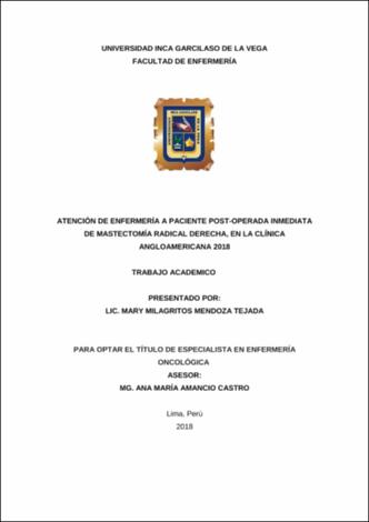 Atención de enfermería a paciente post-operada inmediata de mastectomía radical derecha, en la clínica angloamericana 2018