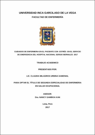| dc.description.abstract | The present academic work was applied through a clinical case to a 44 year old female patient with work stress with the objective of identifying the level of work stress and improving their interaction and adaptation with their environment in the nurse who works to the emergency service of the National Hospital Sergio Bernales. The assessment applied by NANDA taxonomy, presents 4 diagnostics real problems and 3 of risk. The planning is developed on the basis to meet her needs before a self-assessment that can adequately address them so that they do not entail altering the health of the worker | en_US |
