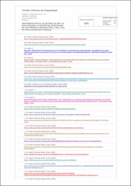 | dc.description.abstract | El presente trabajo de suficiencia profesional titulado implementación de un sistema de MRP I/II para mejorar la gestión de inventarios en una empresa constructora, Lima, 2024, tuvo como objetivo el de determinar la relación entre la implementación de un sistema de MRP I/II y la mejora en la gestión de inventarios en una empresa constructora, Lima, 2024, ya que la inacción de las mejoras en el traslado de materiales así como de su correcto inventario traen consigo perdidas para la empresa, siendo importante que se implemente mejoras que maximicen las ganancias a través de una buena gestión, llegando a la conclusión que existe una relación directa entre la implementación de un sistema de MRP I/II y la mejora en la gestión de inventarios en una empresa constructora, Lima, 2024, pues permite a la empresa un cambio que moderniza su situación actual abaratando costos y maximizando ganancias. | |