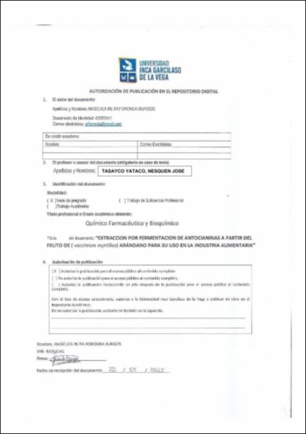 | dc.title | Extracción por fermentación de antocianinas a partir del fruto de ( vaccinium myrtillus) arándano para su uso en la industria alimentaria | |